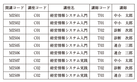 以下に示す表は、ある学校における特定の期間中の開講講座の一覧である。この表に関する正規化の観点からの記述の正誤の組み合わせとして、最も適切なものを下記の解答群から選べ。なお、この表の主キーは「開講コード」であり、また、それぞれの講師は開講コードの異なる同一名の講座を担当することがある。