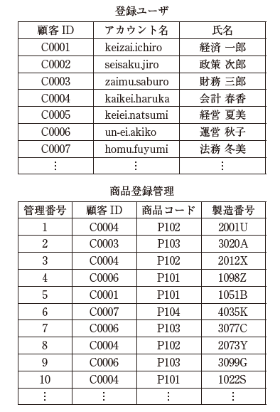 あるメーカーでは、カスタマーサポートや新製品のプロモーションなどのために、Webサイトを通じて顧客にユーザ登録と購入した商品の登録を働きかけている。以下に示す「登録ユーザ」表は、ユーザ登録済みの顧客に関するデータを表し、また「商品登録管理」表は、ユーザ登録済みの顧客が自身で登録した、購入済み商品に関するデータを表している。なお、ユーザ登録をしている顧客の中には、商品登録を行っていない者もいる。