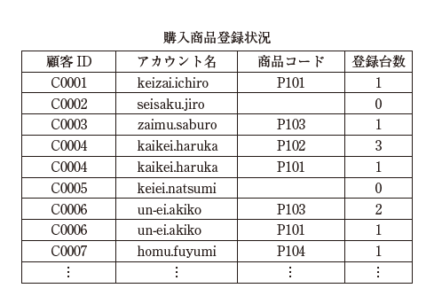 この2つのデータから、登録ユーザごとの商品登録状況を確認するために、次に示す「購入商品登録状況」表を得ることを考える。