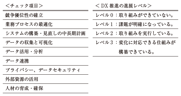 情報処理推進機構(IPA)が公開している「中小規模製造業者の製造分野におけるデジタルトランスフォーメーション(DX)推進のためのガイド」では、自社の課題を把握し、その解決策を導くツールとして「製造分野DX度チェック」が提供されている。このツールでは、以下に示す9つのチェック項目について、レベル0からレベル3までの進展レベルで評価する。