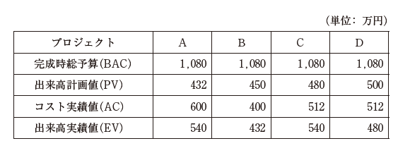 ある中小企業では、完成時総予算が1,080万円で、期間が半年の4つのプロジェクトA、B、C、Dが実施されている。プロジェクト期間がちょうど半分を経過した時点で、各プロジェクトの進捗をまとめたところ、次の表が得られた。